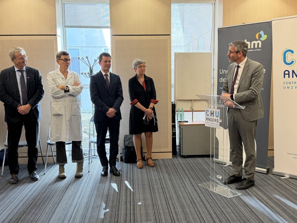 L’inauguration de l’anatomocythopathologie numérique s’est déroulée en présence de Cécile Jaglin-Grimonprez, Directrice Générale du CHU d’Angers, Jérôme Jumel, Directeur Général de l’ARS Pays de la Loire, Guillaume Laurent, Directeur Général du Centre Hospitalier du Mans, et le Pr Marie-Christine Copin, cheffe du service Pathologie cellulaire et tissulaire au CHU et des représentants des deux services hospitaliers et de la Ligue contre le cancer.